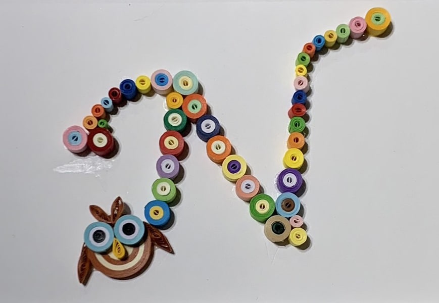 専用のスティックに細長い紙をクルクル巻いて作ったパーツを貼り付けて作品を作る「ペーパークイリング」で、名前の頭文字を作ります。親子でご参加いただけます。